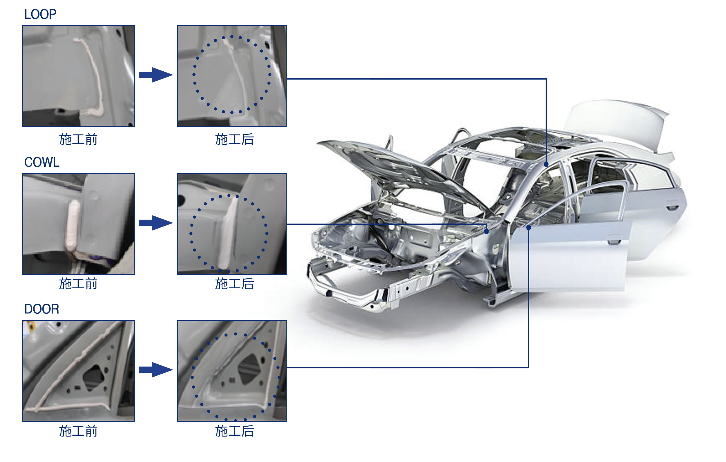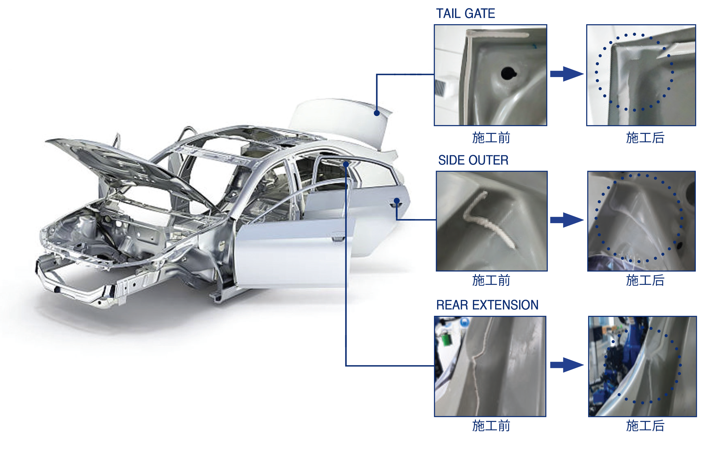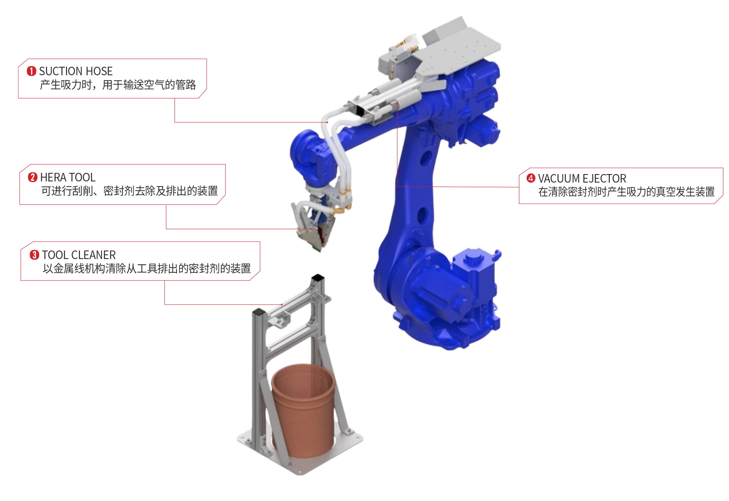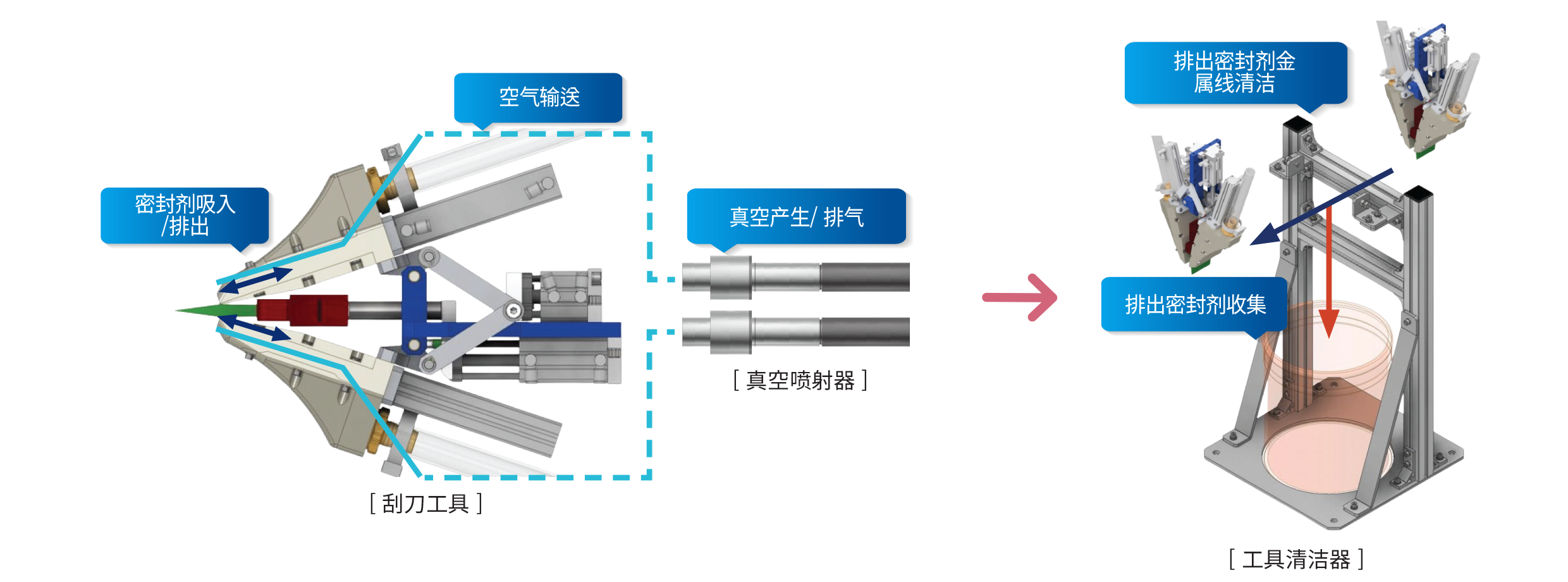 该系统将原先用于消除密封剂干涉和提升外观品质的人工刮刀作业实现自动化。 通过一体化刮刀工具,可实现连续刮削、密封剂去除与排出,提高生产效率并确保品质一致性。