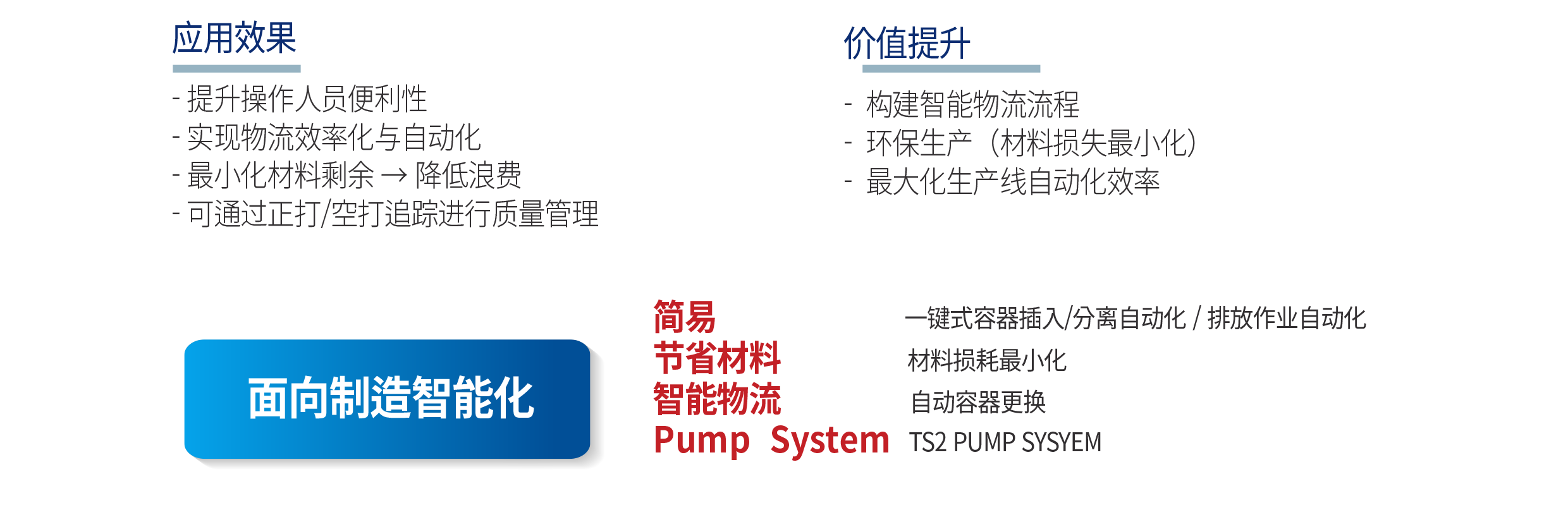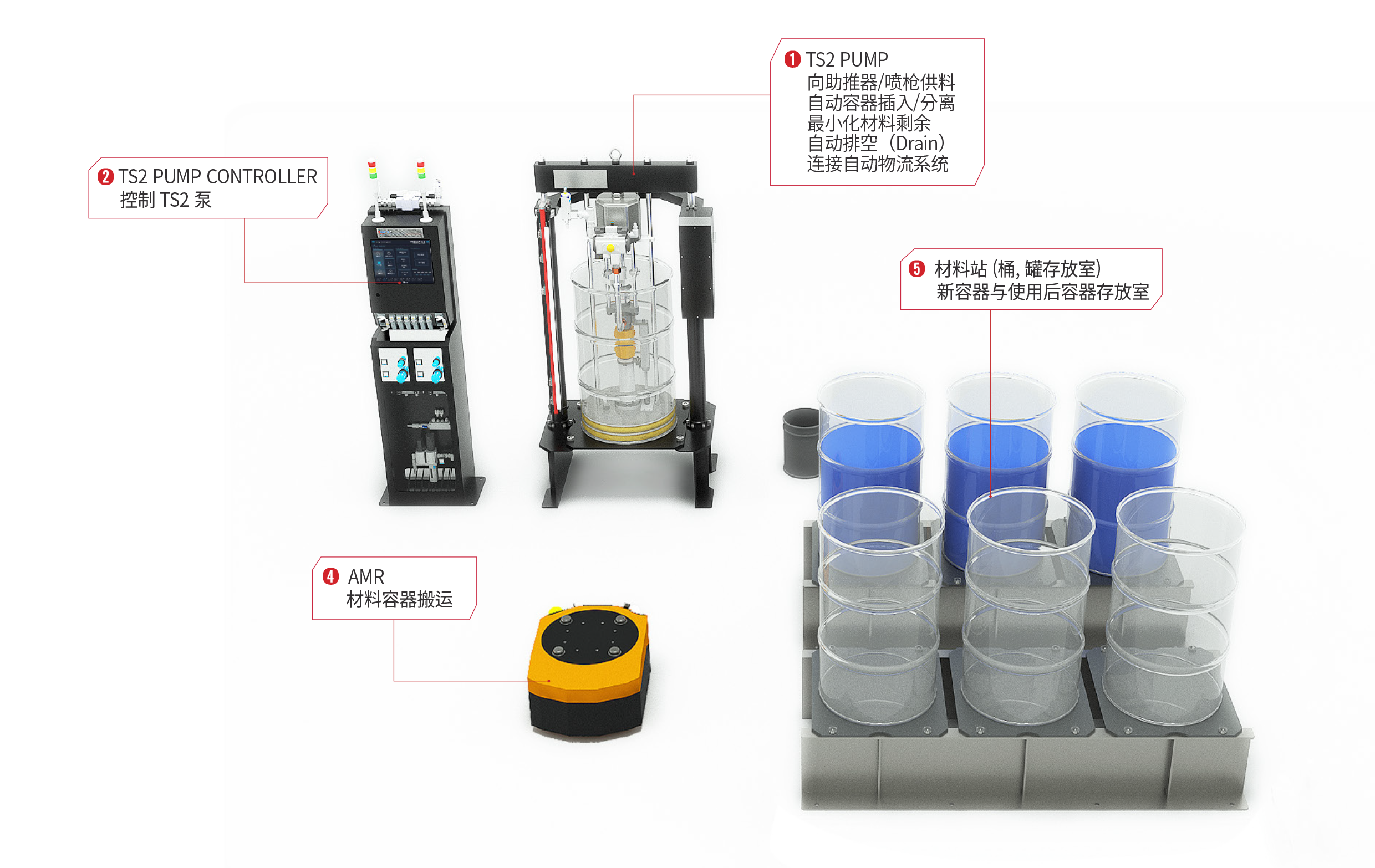 TS2 泵是一款实现容器插入/分离及排空作业自动化的智能物流泵系统。 通过一键式自动插入/分离、自动排空以及自动容器更换功能,可提升作业效率,并通过残量最小化与防跌落结构来减少材料浪费。 同时,通过追踪实料/空打状态,可实现质量管理,从而确保生产线的效率与稳定性。