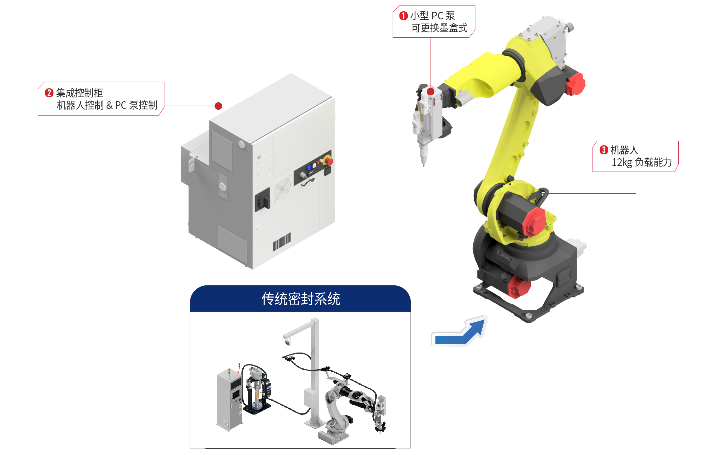 本系统为新一代机器人密封解决方案,通过完全整合机器人与点胶设备,取消了供料泵和加热软管,采用可更换墨盒方式。与机器人控制器实现一体化控制,使管理与维护更加简单,同时提升生产线设计的灵活性与效率。